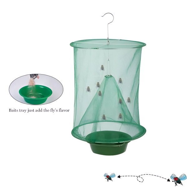 Šis piekaramais mušu slazds ir nekaitīgs, bez toksiskiem insekticīdiem un ķīmiskām vielām. Jums tikai jāizmanto ēsma, lai pievilinātu mušas, un pēc tam, kad tās būs iekļuvušas būrī, tās dabiski nomirs barības trūkuma dēļ. Tā ir labākā izvēle plašām āra teritorijām, piemēram, zālieniem, parkiem, tirgiem, ēdnīcām, restorāniem, kautuvēm, fermām, zaļajām joslām, tualetēm, atkritumu tvertnēm (uz zemes) un citām sabiedriskām vietām.