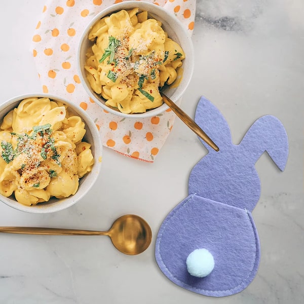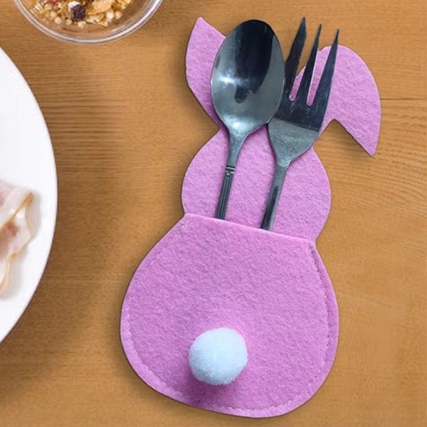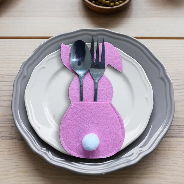 Materiāls: Augstas kvalitātes filcs Izmērs: 15 x 8,5 cm Krāsas: Zila, rozā, dzeltena un violeta Iepakojumā ietilpst: 4 x Zaķa formas galda piederumu turētāji