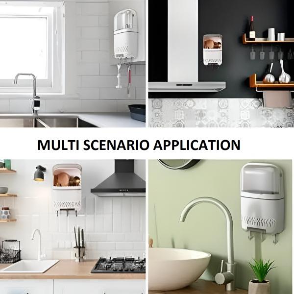 Uzturiet savu virtuvi sakoptu ar mūsu piekarināmo piederumu turētāju, efektīvi atbrīvojot dārgo vietu uz darba virsmas un atvilktnēs.