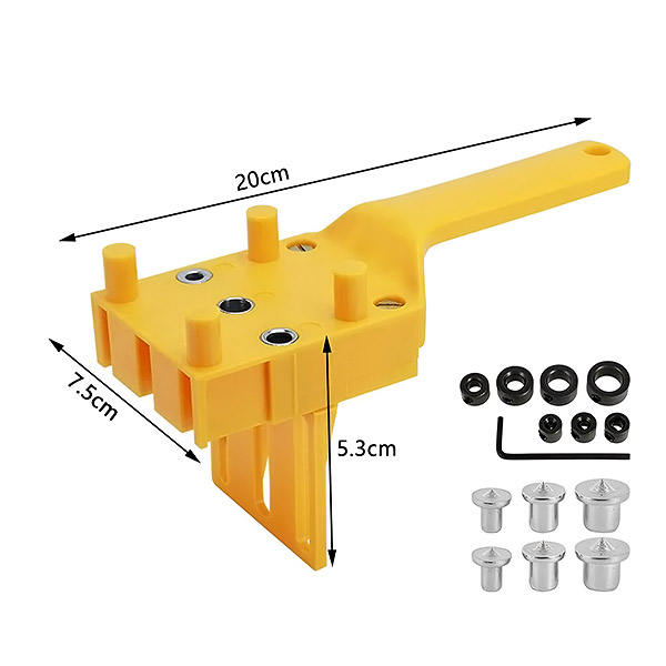 📦 Pilns komplekts: šablons + 6 centrēšanas punkti + 7 dziļuma gredzeni + atslēga